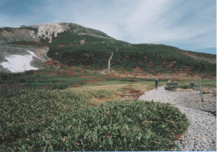 【前年の残雪と紅葉の弥陀ヶ原から見た御前峰】